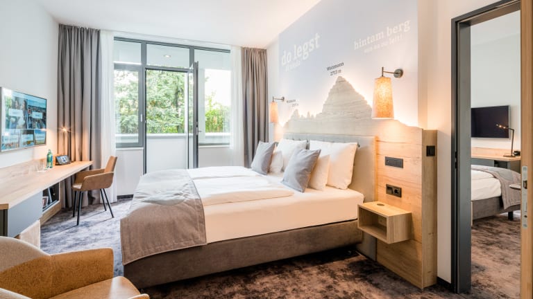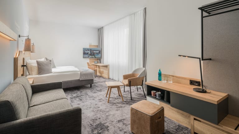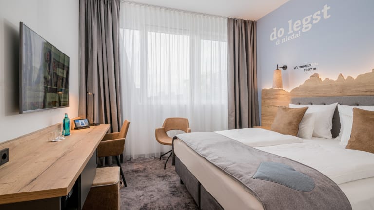 Checken Sie ein in eines unserer 220 neuen Hotelzimmer – im Alpen-Chic – für Businesstrips oder Städtetouren. Unsere Doppelzimmer bieten Ihnen zwischen 18qm und 38qm alles, was Sie für einen erholsamen Schlaf in unseren extralangen Betten brauchen. Dazu kommt unser kostenfreies W-Lan, riesige Flatscreens mit Chromocast Übertragung, induktiven Ladeflächen in den Nachttischen für Ihr Handy und vielem mehr. Einige der Doppelzimmer sind mit Terrasse oder Balkon ausgestattet und viele Zimmer sind barrierefrei. Unsere Einzelzimmer mit 19qm lassen in punkto Ausstattung ebenfalls keine Wünsche offen. Die Einzelzimmer sind Eckzimmer und verfügen daher über extra viel Tageslicht.