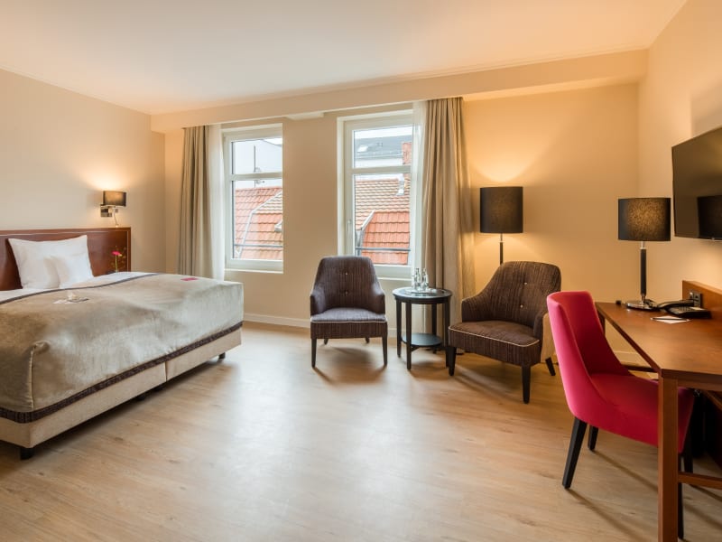 In insgesamt 92 ndividuell eingerichteten Zimmern unseres Hauses können sich unsere Gäste nach arbeitsreichen Stunden, einer langen Anreise oder auch einem abwechslunsreichen Ausflug in Erfurt und Umgebung entspannen, um erholt in den nächsten Tag zu starten. Alle Zimmer, welche in den Kategorien Standard, Komfort, Superior, Studio und Suite unterteilt werden, verfügen über folgende Ausstattungsmerkmale: Farb-TV, Verdunkelungsmöglichkeit, Telefon, Schreibtisch, Sitzgelegenheit, Minibar, Satelliten-TV, Fernbedienung zum TV, Pay-TV, Radio oder Radiowecker, Telefon - Direktdurchwahl in das Zimmer von aussen, Dusche/WC, Kosmetikspiegel im Bad, Haartrockner im Bad, Analoger Telefonanschluß, Digitaler Telefonanschluß, kostenfreien Internetzugang (W-Lan), Elektronische Schlüsselkarten. Einige Zimmer verfügen über eine Badewanne, Klimaanlage, separate Schlafcouch, Balkon und eine ruhige Lage.