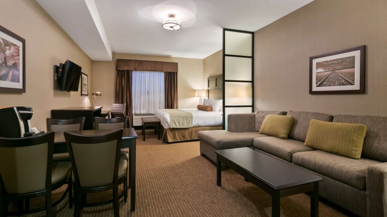 Das Best Western Plus Okotoks Inn & Suites in Okotoks bietet seinen Gästen einen komfortablen Aufenthalt in einer ländlichen Umgebung. Das Hotel verfügt über moderne Annehmlichkeiten wie einen Innenpool, eine Wasserrutsche und einen Whirlpool. Das Frühstück ist im Preis inbegriffen und es gibt auch ein kleines Lebensmittelgeschäft in der Unterkunft. Das Hotel bietet kostenloses WLAN, einen 24-Stunden-Businesscenter und einen Express-Check-in. Es gibt auch Veranstaltungsräume für Konferenzen und Tagungen. Die Zimmer sind komfortabel eingerichtet und verfügen über Annehmlichkeiten wie Mikrowelle und LED-Fernseher. Das Hotel befindet sich in der Nähe von Sehenswürdigkeiten wie dem Seaman Stadium und der Altitude Art Gallery.