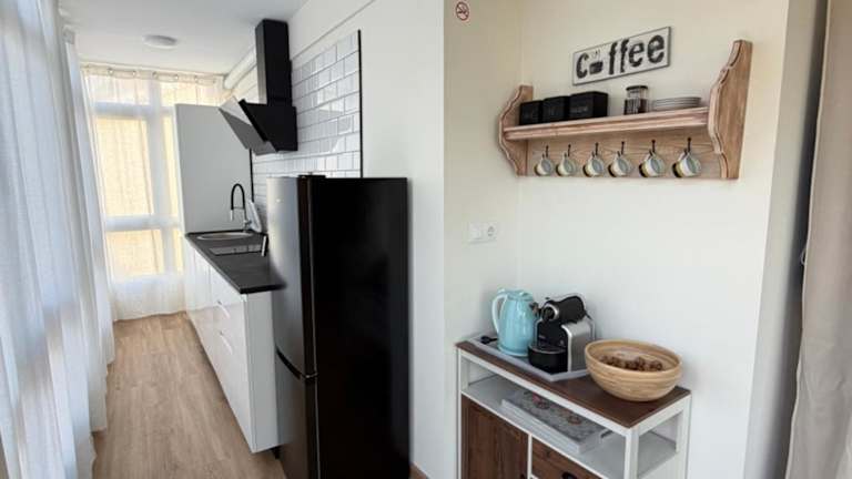 Die Unterkunft verfügt über eine voll ausgestattete Küche mit einem Essbereich. Die Küche ist mit einem Kühlschrank, einem Geschirrspüler, einer Mikrowelle, einer Kaffeemaschine und einem Wasserkocher ausgestattet.