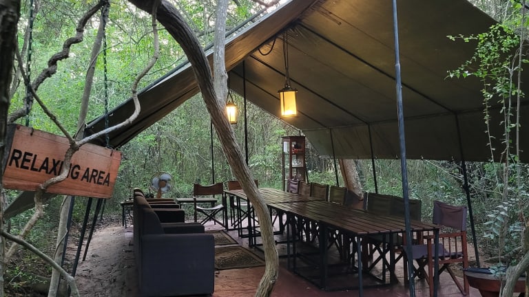 Jedes Zelt ist komfortabel eingerichtet mit einem erhöhten Bett, Matratze, Kissen, Bettwäsche und Handtüchern. Die Zelte verfügen über einen Ventilator, einen Sitzbereich, einen Schreibtisch und kostenfreie Wasserflaschen. Das eigene Bad ist mit einer Warm- und Kaltwasserdusche sowie einem WC ausgestattet.