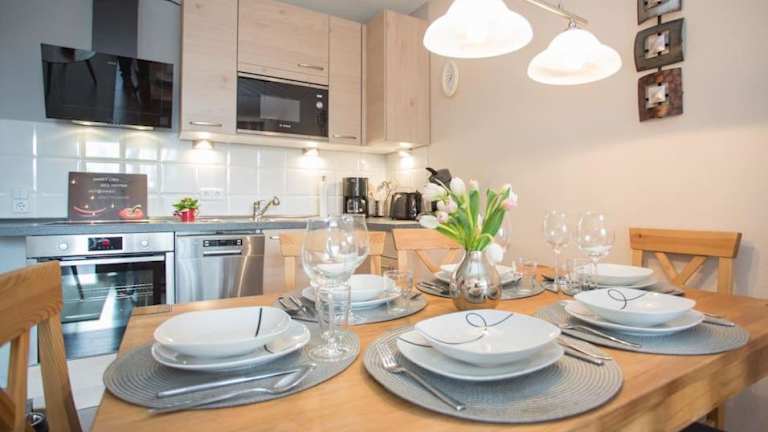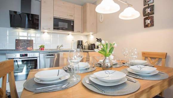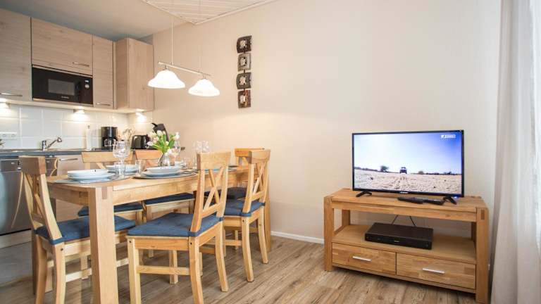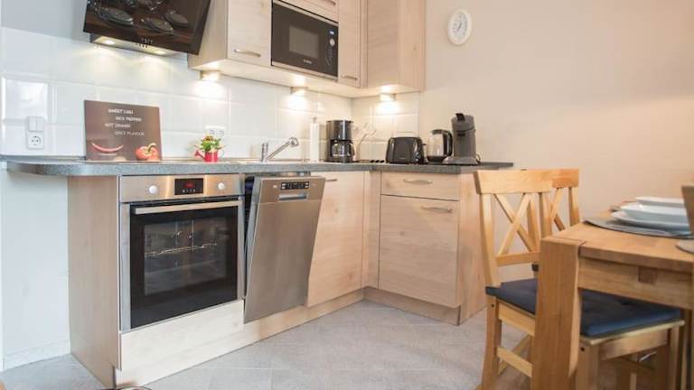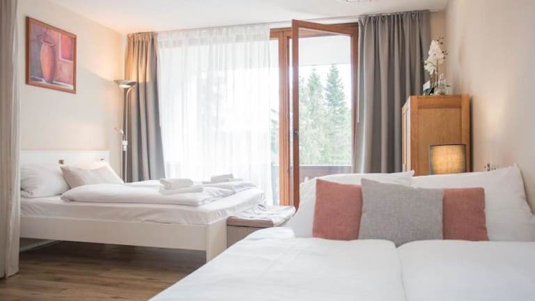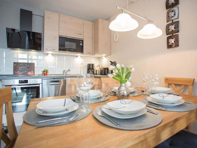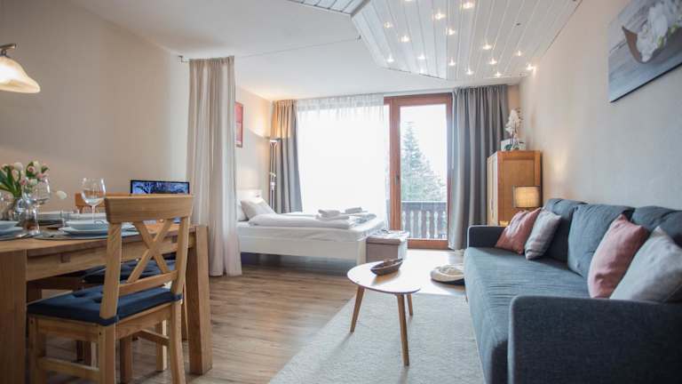 Die Ferienwohnung umfasst 2 Schlafzimmer, ein Wohnzimmer mit Flachbild-TV, eine gut ausgestattete Küche mit Kühlschrank und Geschirrspüler sowie ein Badezimmer mit Dusche. Ein Balkon mit Bergblick und ein Abstellraum für Skier sind ebenfalls vorhanden. Bettwäsche und Handtücher werden bereitgestellt.