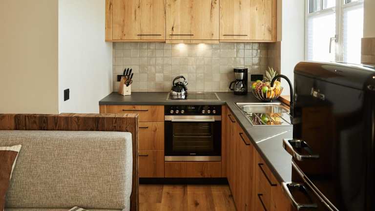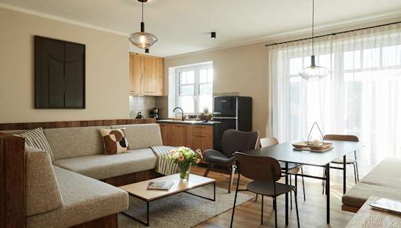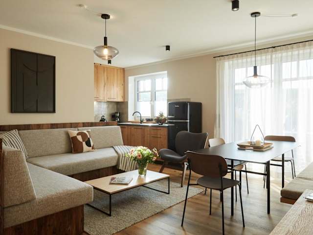 Die Ferienwohnung befindet sich im Erdgeschoss und umfasst 2 Schlafzimmer. Sie ist ausgestattet mit einem TV mit Satellitenkanälen, einer voll ausgestatteten Küche mit Kühlschrank und Geschirrspüler. Handtücher und Bettwäsche werden zur Verfügung gestellt.
