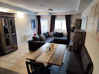 Die Unterkunft besitzt eine Küchenzeile, ausgestattet mit einem Kühlschrank, Geschirrspüler, Ofen und Kaffeemaschine, die die Selbstverpflegung ermöglicht.
