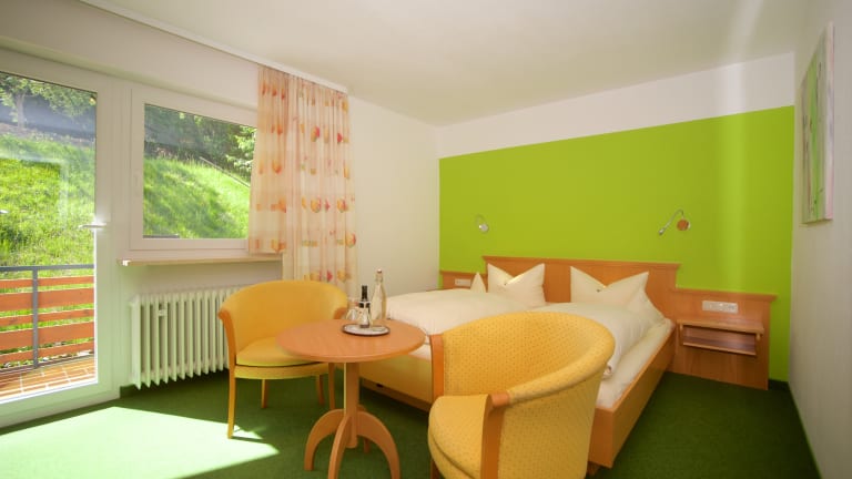 ruhige, gemütliche Doppel- und Einzelzimmer mit Dusche/WC, Haarfön, Kosmetikartikel und Kosmetikspiegel, SAT-TV, Radio und Balkon mit Sonnenstühlen, Frühstücksraum, Terrasse mit Tischen, Stühlen und Sonnenschirmen
