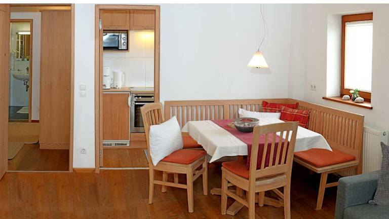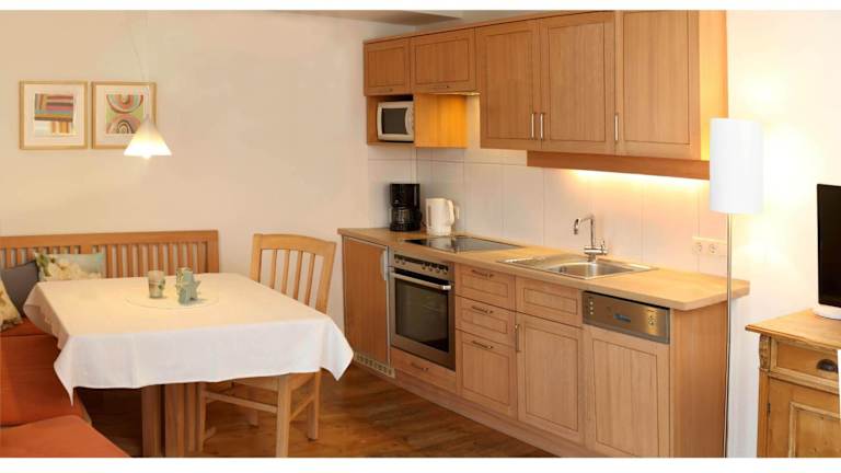 Die Naturappartements sind mit einer eigenen Küche ausgestattet, die einen Kühlschrank, einen Geschirrspüler, einen Ofen und eine Kaffeemaschine umfasst. Die Zimmer bieten somit die Möglichkeit, selber zu kochen und eine gemütliche Mahlzeit zu geniessen.