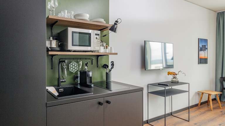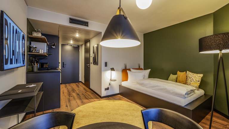 Willkommen in den Black F Serviced Apartments! Bei uns wird „Wohnen auf Zeit“ neu interpretiert. Unsere stilvoll und hochwertig eingerichteten Serviced Apartments vereinen den Wohlfühl-Charakter einer Wohnung mit einem zeitgemäßen Mix aus klassischen und digitalen Services. Ob zwei Nächte oder mehrere Monate, Projektmitarbeiter*innen, Doktorand*innen, Geschäfts- oder Langzeitreisende, Wohnungssuchende oder Tourist*innen: Im Black F kommt jeder Gast in den Genuss badischer Gastfreundschaft. In unseren voll möblierten und hochwertig ausgestatteten Serviced Apartments können unsere Gäste direkt „loswohnen“. Eine voll ausgestattete Kitchenette, ein gemütlicher Ess-, Wohn- und Schlafbereich und ein großzügiges Badezimmer bieten eine wohnungsähnliche Atmosphäre. Ausreichend Stauraum, große Ablageflächen, gute Beleuchtung und viele Steckdosen gehören maßgeblich zur Ausstattung dazu. Sowohl im „Clean-up“- als auch im „Laundry“-Room steht alles für eine eigenständige Zimmer- und Wäschereinigung zur Verfügung. Die Freiheit und Unabhängigkeit aus den eigenen vier Wänden werden spürbar. Trotz aller Eigenständigkeit wird Service im Black F großgeschrieben. Wöchentliche Zimmerreinigung und Wäschewechsel sowie kostenloses WLAN mit unkompliziertem Zugang sind inklusive. Digitalisierung spielt im Black F eine zentrale Rolle. Der digitale Check-In und Check-Out ermöglichen eine flexible An- und Abreise ohne Wartezeiten an der Rezeption. Jeder Gast erhält seinen persönlichen Zugangscode per E-Mail vor dem Anreisetag. In der digitalen Gästemappe finden sich alle nützlichen Informationen für den Aufenthalt, Wünsche und Anmerkungen können online an das Black F-Team weitergegeben werden. Ebenso unkompliziert und schnell geht der Check-Out, der inklusive automatischer Rechnungsstellung und digitalem Versand ist. Wer es lieber klassisch analog mag, findet im Black F-Team einen zuverlässigen Ansprechpartner. Unser junges Team empfängt jeden Gast persönlich und heißt ihn herzlich willkommen.