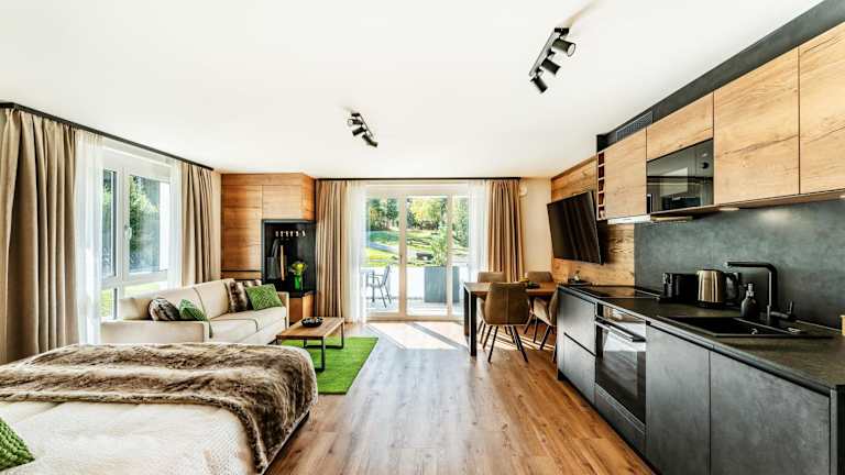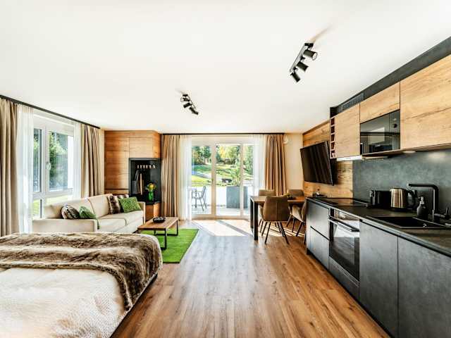 Das Apartment ist ausgestattet mit einem Schlafzimmer und einem Badezimmer. Es verfügt über Bettwäsche, Handtücher, einen Flachbild-TV sowie einen Essbereich. Eine voll ausgestattete Küche ist ebenfalls vorhanden. Eine Terrasse mit Gartenblick ergänzt die Annehmlichkeiten der Unterkunft. Die Zimmer sind schallisoliert und bieten Heizung sowie Zugang über einen Aufzug.
