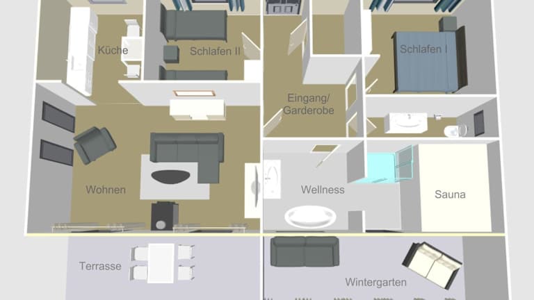 Das Ferienhaus verfügt über zwei Schlafzimmer, eine Terrasse mit Bergblick, einen Balkon mit Gartenblick sowie einen Satelliten-Flachbild-TV. Eine gut ausgestattete Küche mit Kühlschrank, Geschirrspüler und Ofen ist ebenfalls vorhanden. Das Bad ist mit einer Dusche und einem Haartrockner ausgestattet.
