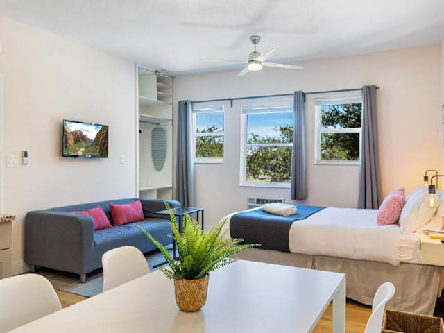Die klimatisierte Ferienwohnung verfügt über ein Schlafzimmer, einen TV, einen Essbereich und eine voll ausgestattete Küche mit Kühlschrank und Ofen.