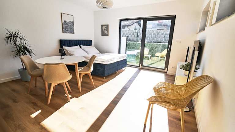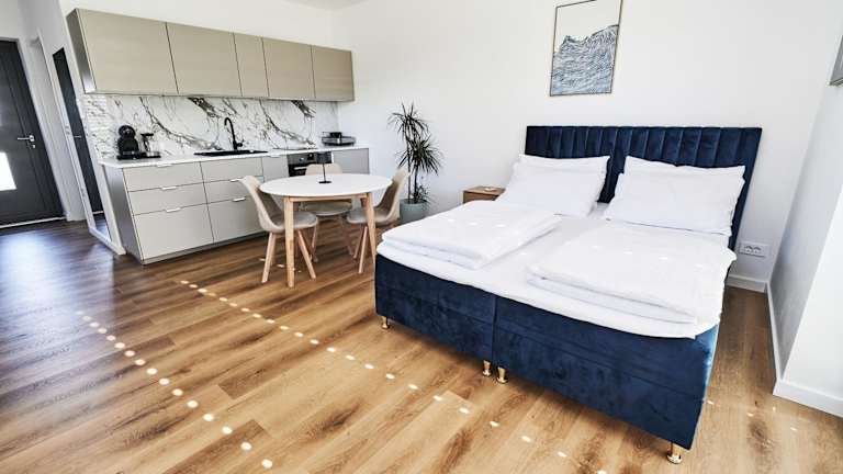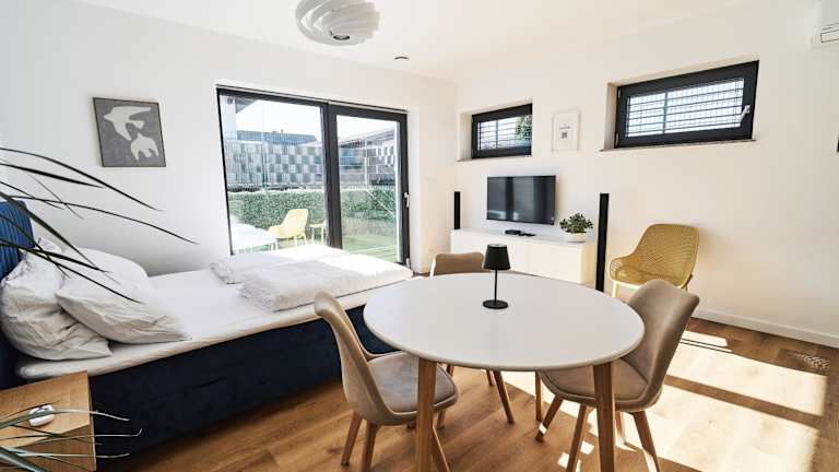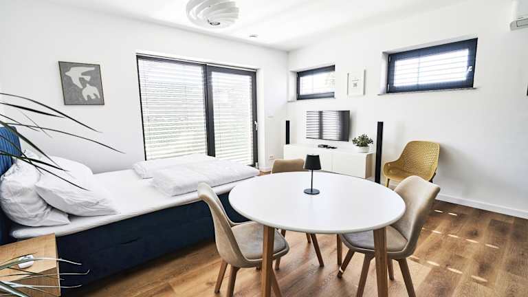 Die Unterkunft umfasst ein Schlafzimmer sowie eine Küche, die mit einem Kühlschrank und einem Ofen ausgestattet ist. Des Weiteren gibt es ein Badezimmer mit Dusche, Haartrockner und Waschmaschine. Handtücher und Bettwäsche werden bereitgestellt. Die Ferienwohnung ist mit WLAN, Heizung, Klimaanlage und einem Hosenbügler ausgestattet.