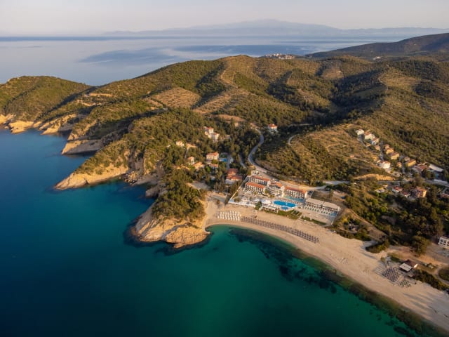 Das Blue Dream Palace Trypiti Beach Spa Resort & Hive Water Park liegt direkt am Strand und bietet einen herrlichen Ausblick auf das Meer. Die umliegenden grünen Hügel und gepflegten Gärten schaffen eine idyllische Atmosphäre. In der Nähe des Hotels gibt es verschiedene Freizeitmöglichkeiten wie ein Spielzimmer und einen Kinderspielplatz. Das Hotel organisiert auch griechische Abende für seine Gäste.