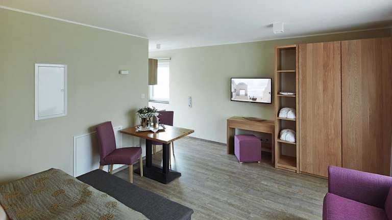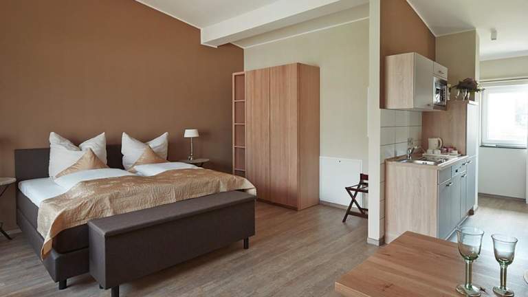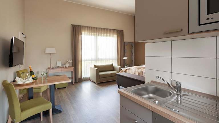 In jeder Wohneinheit gibt es eine voll ausgestattete Küche mit einem Esstisch, einen Flachbild-TV mit Satellitenkanälen sowie ein eigenes Badezimmer mit Dusche und kostenlosen Pflegeprodukten. Zur Ausstattung gehören auch ein Kühlschrank, Geschirrspüler, Mikrowelle und Kaffeemaschine. Die Zimmer sind schallisoliert und bieten Bequemlichkeit für einen erholsamen Aufenthalt.