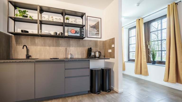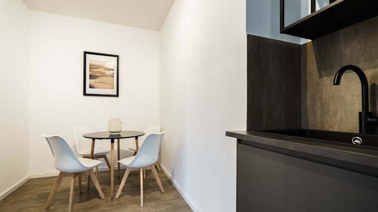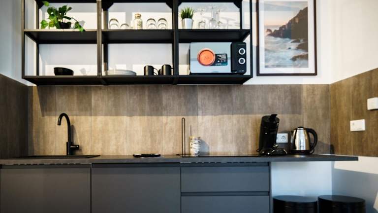 Die Ferienwohnung umfasst eine voll ausgestattete Küche mit Kühlschrank und Kaffeemaschine, was die Zubereitung eigener Mahlzeiten ermöglicht. Essenslieferungen in die Unterkunft sind auf Anfrage ebenfalls möglich.