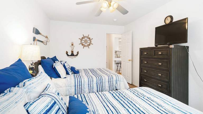 Die Ferienwohnung verfügt über 2 Schlafzimmer und 2 Badezimmer. Die Küche ist gut ausgestattet und bietet einen Kühlschrank, einen Ofen, eine Mikrowelle und einen Wasserkocher mit Kaffee-/Teezubehör. Ein WLAN-Internetzugang steht zur Verfügung und es gibt eine breite Auswahl an Kanälen per Kabelempfang für Unterhaltung.