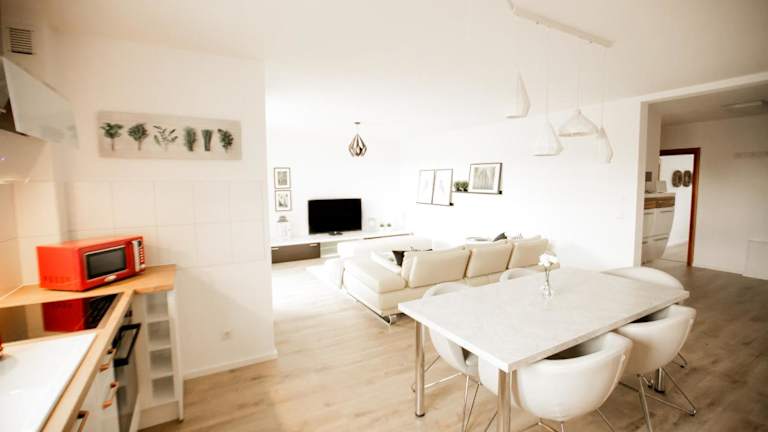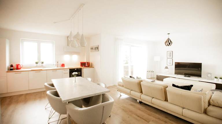 Die Ferienwohnung besteht aus zwei Schlafzimmern, einem Wohnzimmer, einer gut ausgestatteten Küche sowie zwei Badezimmern mit Dusche und Badewanne. Handtücher und Bettwäsche werden bereitgestellt. Ein Satelliten-Flachbild-TV ist ebenfalls vorhanden.