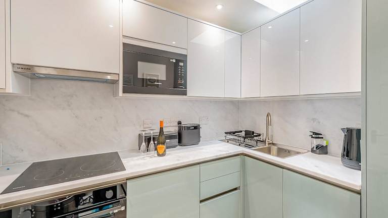 Die Unterkunft verfügt über ein Schlafzimmer und ein Badezimmer. Die Küche ist mit modernen Geräten ausgestattet, darunter ein Geschirrspüler und eine Waschmaschine, was zusätzlichen Komfort und Bequemlichkeit während des Aufenthalts bietet.