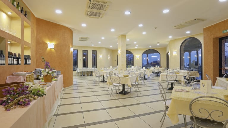 Die Unterkunft bietet verschiedene Verpflegungsangebote wie Vollpension plus und All Inclusive. Das Hauptrestaurant serviert italienische Küche in Buffetform, inklusive Frühstück, Mittag- und Abendessen. Snacks und Kuchen sind über den Tag verteilt ebenfalls erhältlich. Getränke sind während der Mahlzeiten sowie zu den festgelegten Zeiten im All Inclusive-Angebot enthalten.