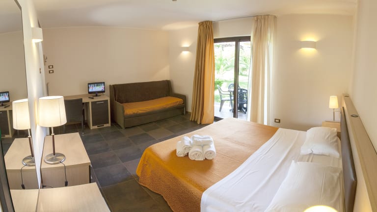 Die Zimmer sind klimatisiert und bieten eine helle Einrichtung mit Annehmlichkeiten wie einem Flat-TV, einem Schreibtisch, einem Safe, einer Minibar und einem eigenen Badezimmer mit Dusche. Es stehen verschiedene Zimmertypen zur Verfügung, darunter Doppelzimmer mit Gartenblick und Familienzimmer, die für bis zu vier Personen ausgelegt sind. Jedes Zimmer hat einen Balkon oder eine Terrasse.