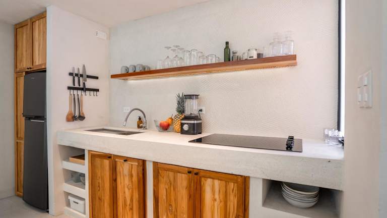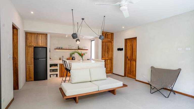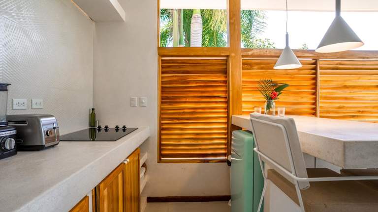 Alle Wohneinheiten verfügen über eine Terrasse mit Poolblick, eine Küche mit einem Kühlschrank und einer Herdplatte sowie ein eigenes Badezimmer mit einer Dusche. Zudem sind alle Wohneinheiten klimatisiert und bieten Sitzplätze und/oder einen Essbereich.