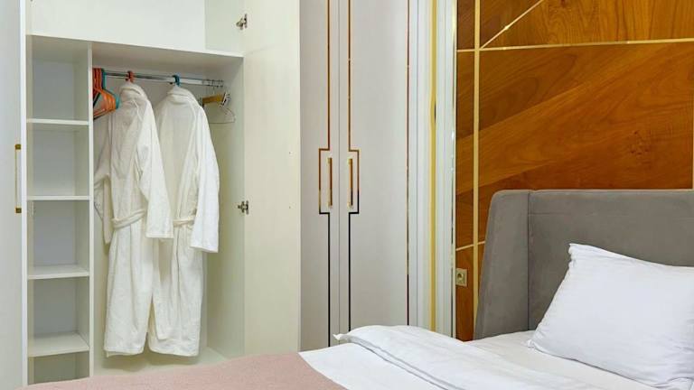 Die Ferienwohnung besteht aus einem Schlafzimmer, einem Wohnzimmer und einem Badezimmer mit Bidet und Dusche. Zur Ausstattung gehören Klimaanlage, Kühlschrank, Wasserkocher sowie Handtücher und Bettwäsche. Ein Balkon und ein Kinderspielplatz stehen ebenfalls zur Verfügung.