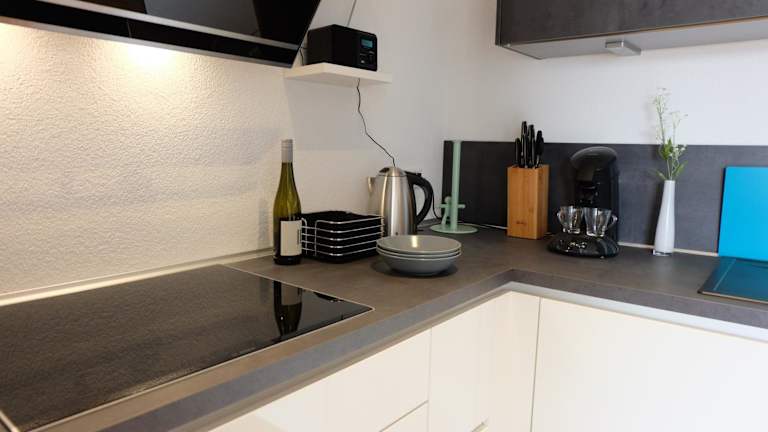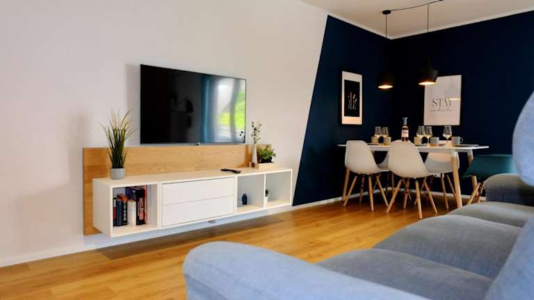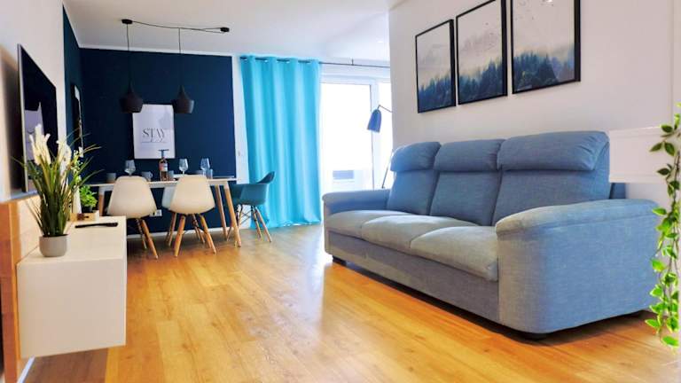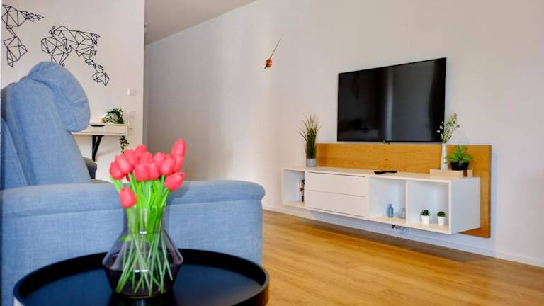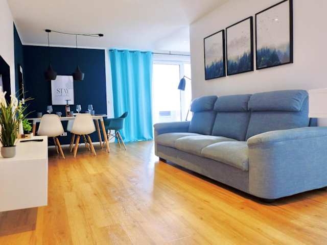Die Ferienwohnung bietet 2 Schlafzimmer und ein Wohnzimmer mit einem Flachbild-TV. Die gut ausgestattete Küche verfügt über einen Kühlschrank und einen Geschirrspüler. Zusätzlich gibt es ein Badezimmer mit einer Dusche. Zur Ausstattung gehören auch Handtücher und Bettwäsche. Der Balkon ermöglicht einen schönen Stadtblick.
