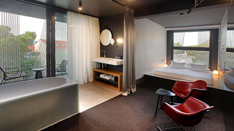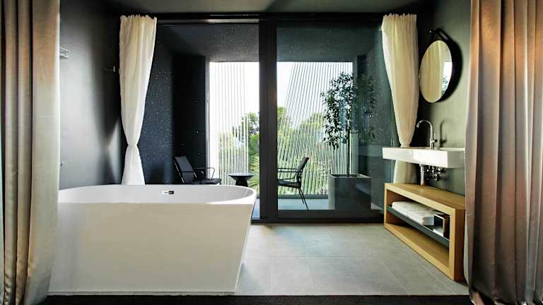 In den klimatisierten Zimmern sorgt eine Heizung für ein angenehmes Raumklima. Die Unterkünfte sind ausgestattet mit einem Balkon oder einer Terrasse, einem Doppelbett, einer Minibar, einem Safe und einer Tee-/Kaffeemaschine. Die Zimmer bieten ein eigenes Bad mit Badewanne oder Dusche, Haartrockner und Pflegeprodukten. Zusätzlich finden Gäste einen Flachbild-TV und WLAN vor. In den Badezimmern sind Kosmetikartikel und Handtücher vorhanden.