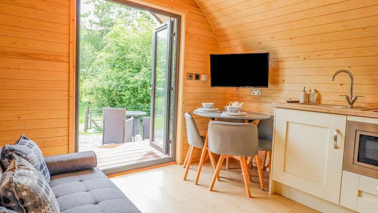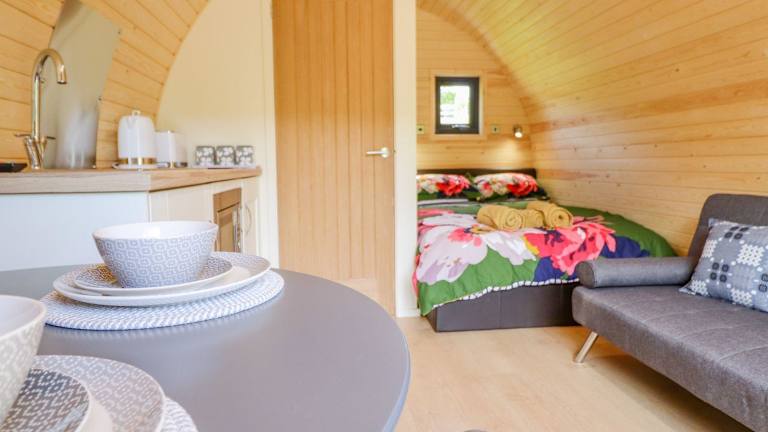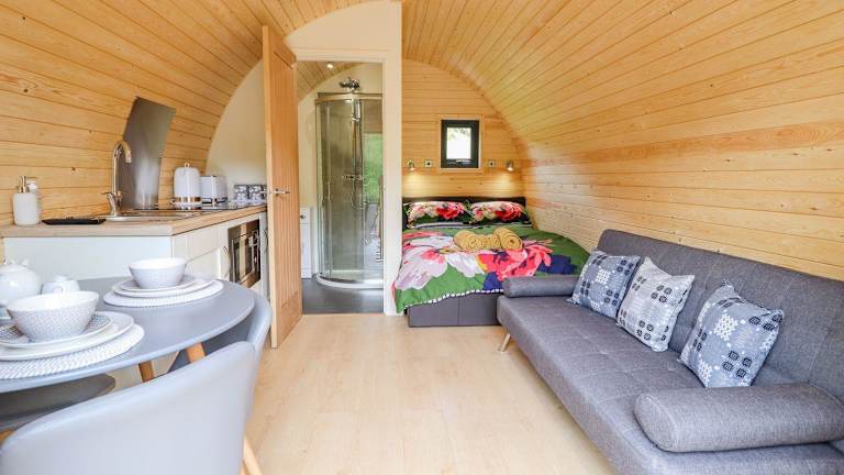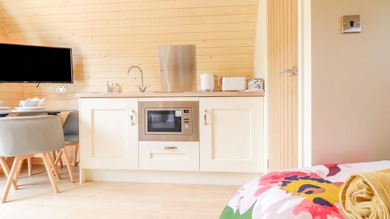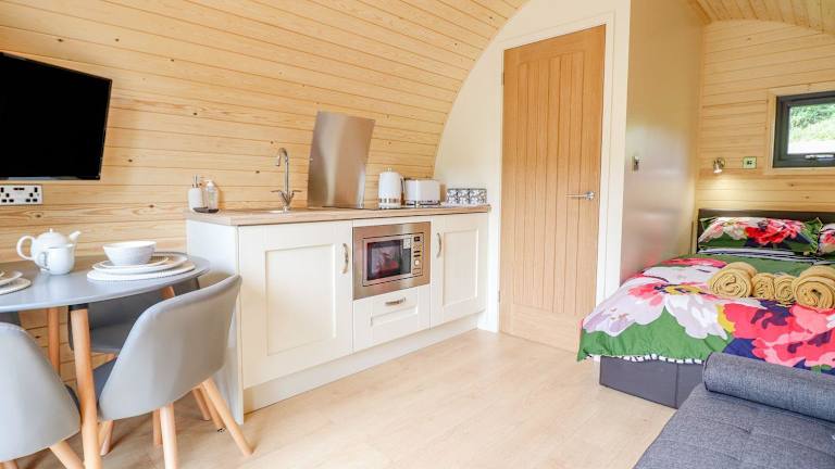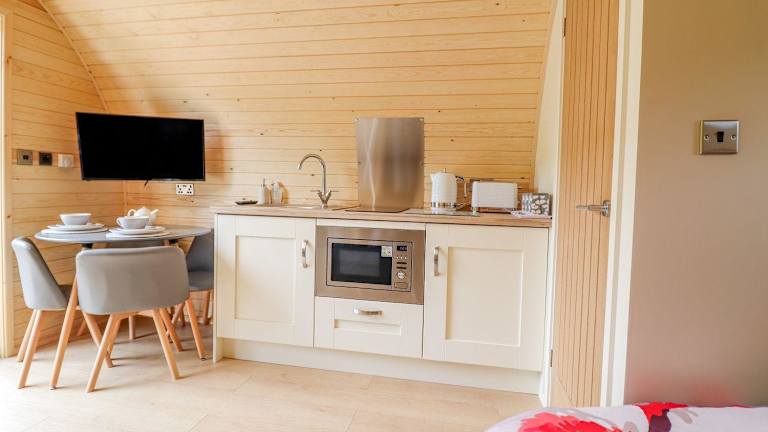 Die Unterkunft umfasst ein Schlafzimmer und ein Badezimmer mit Dusche und Whirlpool. Es gibt einen Sitzbereich sowie eine gut ausgestattete Küche mit Kühlschrank. Ein TV ist ebenfalls vorhanden.