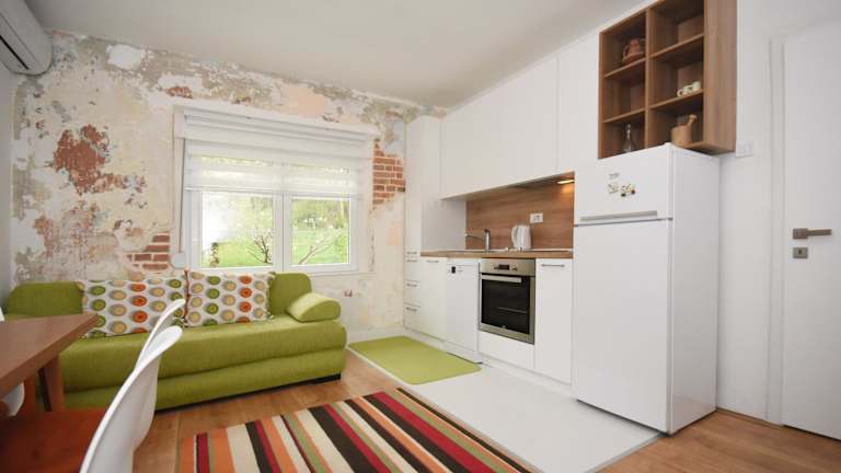 Das Ferienhaus Brick house verfügt über zwei Schlafzimmer, ein Wohnzimmer sowie eine voll ausgestattete Küche mit Kühlschrank und Wasserkocher. Das Badezimmer ist mit einer Dusche und kostenlosen Pflegeprodukten ausgestattet. Klimaanlage sowie Handtücher und Bettwäsche sind ebenfalls vorhanden. Es handelt sich um eine Nichtraucherunterkunft.