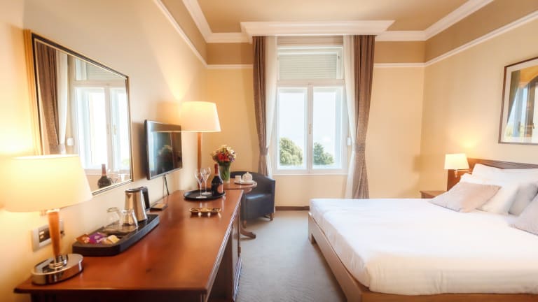 GENIESSEN SIE CHARME ZIMMER MIT EINEM ATEMBERAUBENDEN BLICK Die hellen und freundlichen Innenräume mit gekonnt gesetzten Holzakzenten und edlen Materialien stehen der stilvoll-eleganten Fassade aus der Habsburger Zeit in nichts nach. Genießen Sie den Blick von einem unserer romantischen Balkone auf das Mittelmeer oder auf die klassisch inspirierten Angiolina-Gärten. Oder genießen Sie ein entspannendes Bad im exklusiven Badezimmer, das speziell für unser Hotel entworfen wurde.