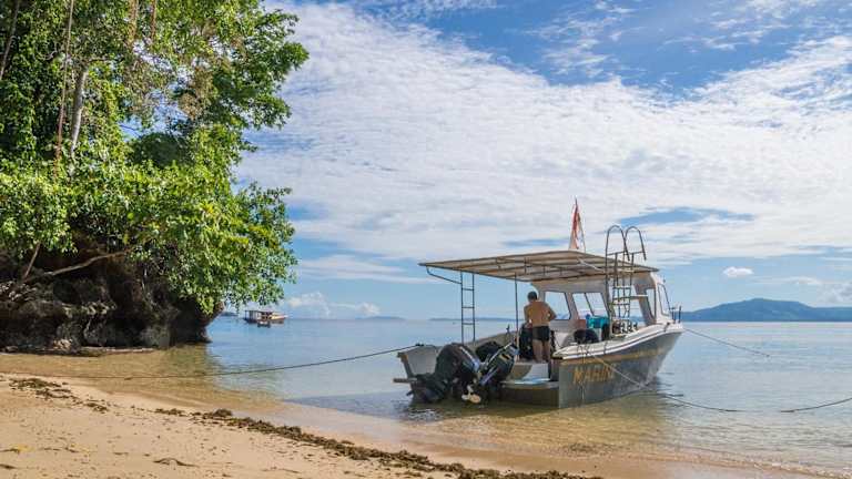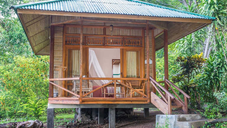 Die schlicht eingerichteten Holzbungalows sind mit einem Ventilator ausgestattet und verfügen über eine eigene Terrasse mit Blick auf das Meer und das Riff. Jedes Bungalow hat ein privates Bad mit Dusche.