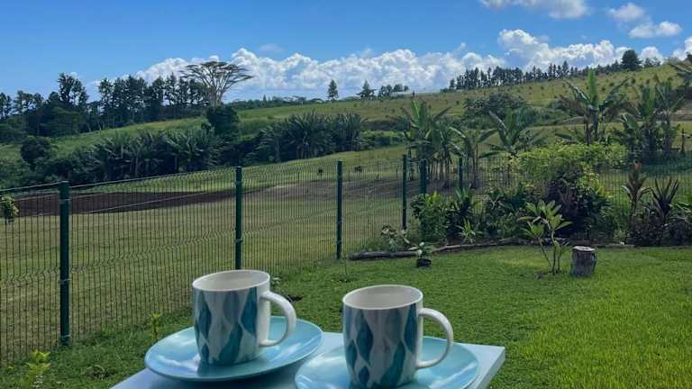 Bungalow Tiny House Puunui ist ein heimeligess Ferienhaus mit Aussicht auf Berge und Garten. Es verfügt über 1 Schlafzimmer und Zugang zu einer Terrasse.