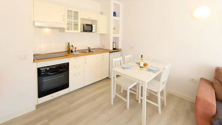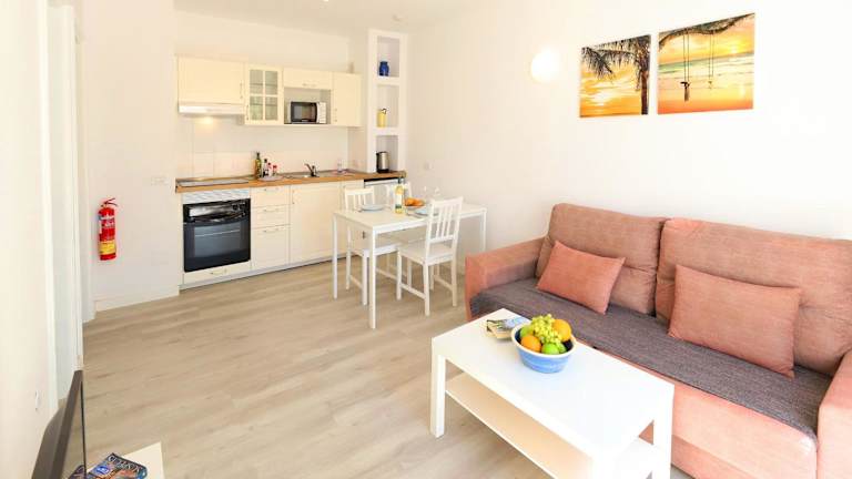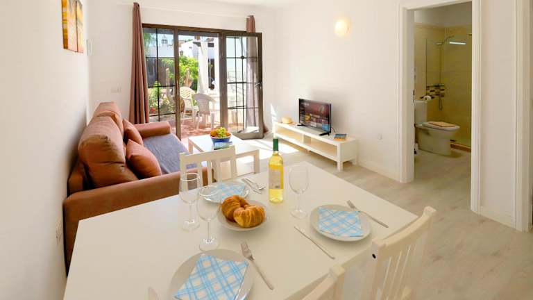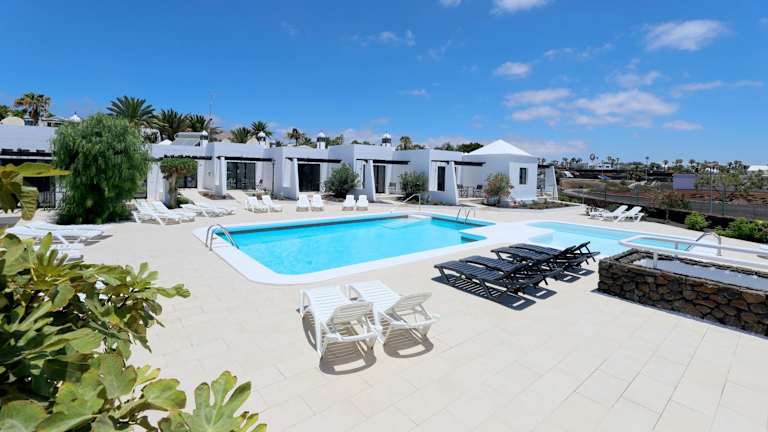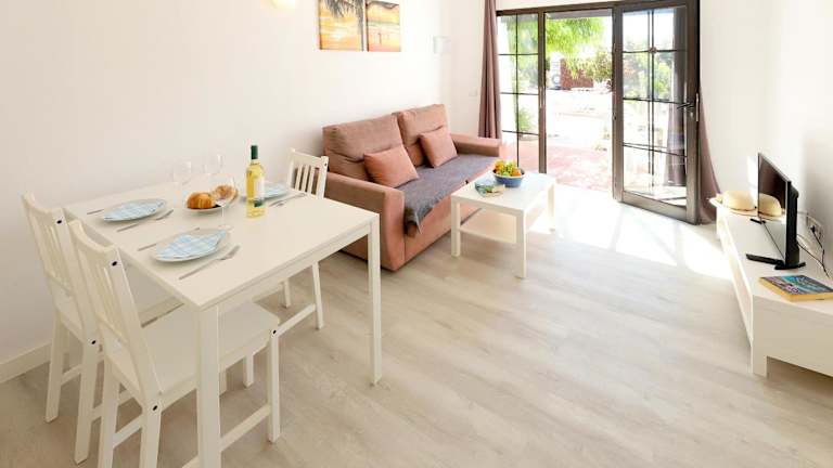 Die Bungalows sind funktional und modern eingerichtet, bieten Platz für einen Wohn-/Essbereich mit einem Sofa und verfügen über eine Küchenzeile mit Backofen und Kochfeld. Ein Sat-TV mit spanischen und britischen Kanälen ist ebenfalls vorhanden. Ein direkter Zugang zur Sonnenterrasse am Pool wird geboten.