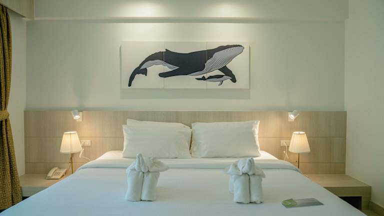 Die Zimmer sind mit Klimaanlage, Balkon oder Terrasse ausgestattet und bieten ein Doppelbett oder Kingsize-Bett. Ein Safe, eine Minibar, ein Schreibtisch sowie eine Tee-/Kaffeemaschine sind Standard. Ein Telefon mit Direktwahl, ein TV-Gerät mit Satelliten-/Kabelempfang und Wifi sorgen für modernes Wohnen. Die Badezimmer haben eine Dusche und Badewanne, Föhn und Kosmetikartikel sind ebenfalls vorhanden. Nichtraucherzimmer sind verfügbar.