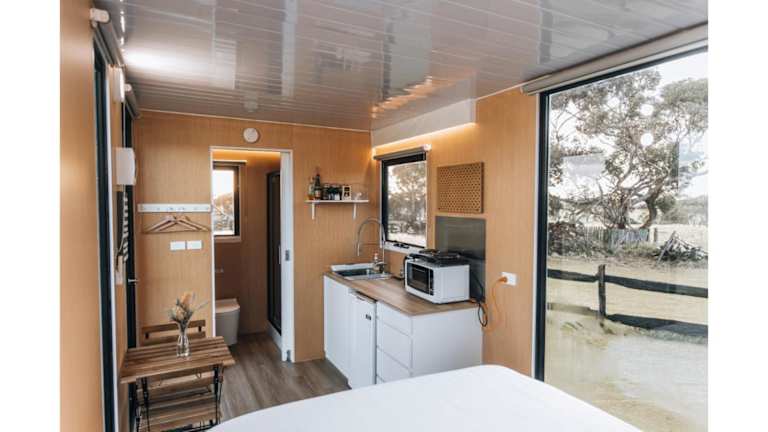 Die Unterkunft Bush Retreat 1 by Tiny Away ist ein gemütliches Ferienhaus mit Klimaanlage und direktem Zugang zu einer Veranda und Terrasse. Hier finden Gäste ein Schlafzimmer sowie eine voll ausgestattete Küche vor. Handtücher und Bettwäsche werden zur Verfügung gestellt, um den Aufenthalt angenehm zu gestalten.