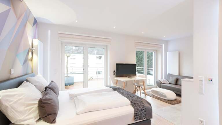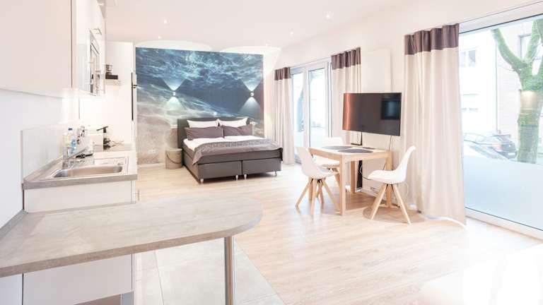 Die Wohneinheiten sind ausgestattet mit einem Sofa, einem Sitzbereich, einem Flachbild-TV sowie einer gut ausgestatteten Küchenzeile mit einem Essbereich. Jede Wohnung verfügt ausserdem über einen Kühlschrank, einen Geschirrspüler, einen Ofen, eine Kaffeemaschine und einen Safe. Das eigene Badezimmer ist mit einem Haartrockner ausgestattet.