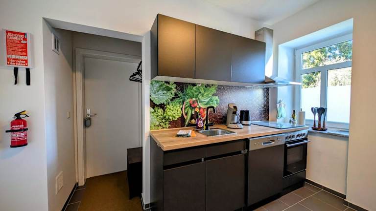 Die Ferienwohnung umfasst 1 Schlafzimmer, ein Wohnzimmer und eine voll ausgestattete Küche mit Kühlschrank und Kaffeemaschine. Des Weiteren steht ein Badezimmer mit Dusche und Haartrockner zur Verfügung. Handtücher und Bettwäsche werden gestellt. In der Wohnung können Gäste kostenfreies WLAN nutzen und es gibt Gartenblick sowie Gartenmöbel.