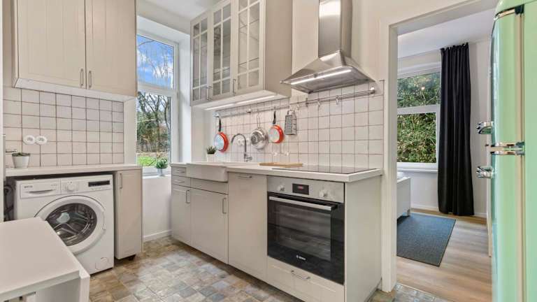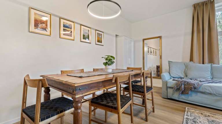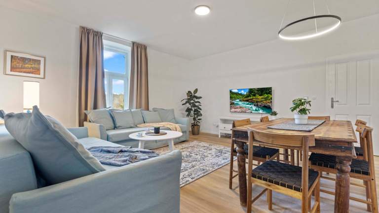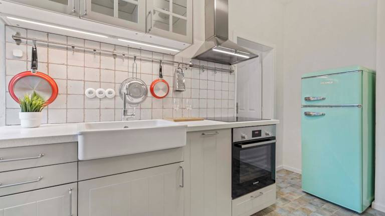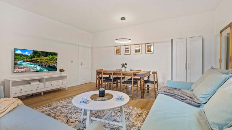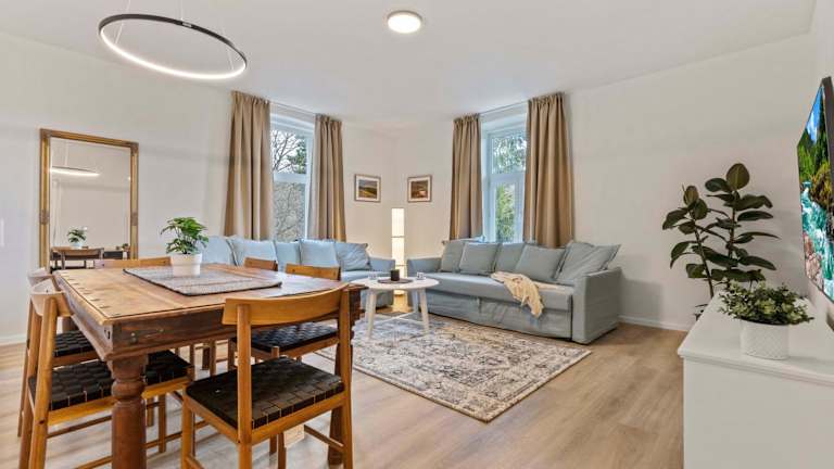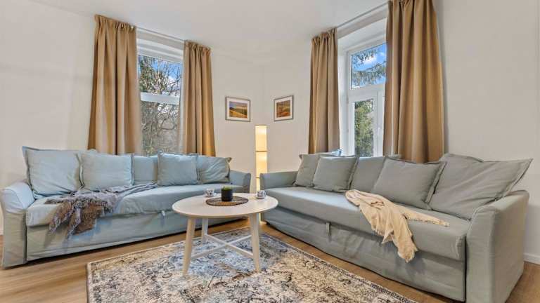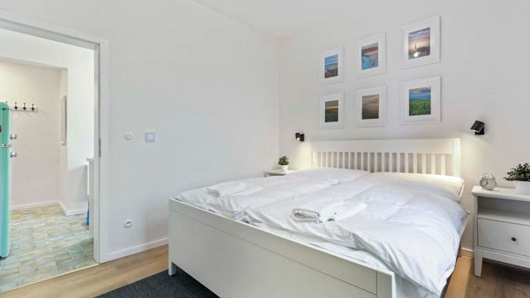 Die Ferienwohnung verfügt über ein Schlafzimmer, ein Wohnzimmer sowie eine voll ausgestattete Küche mit Kühlschrank und Wasserkocher. Das Badezimmer ist sowohl mit einer Badewanne als auch mit einer Dusche ausgestattet. Handtücher und Bettwäsche werden bereitgestellt.