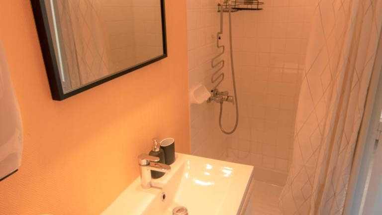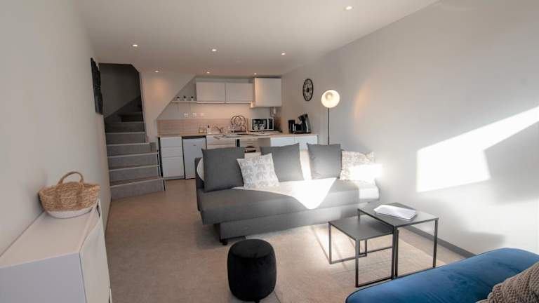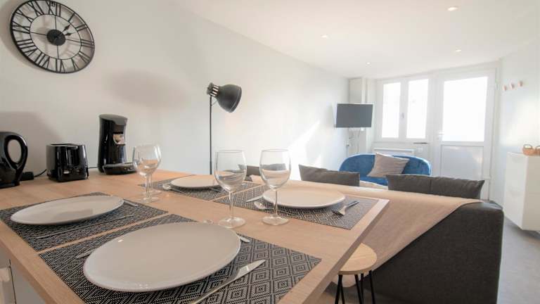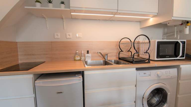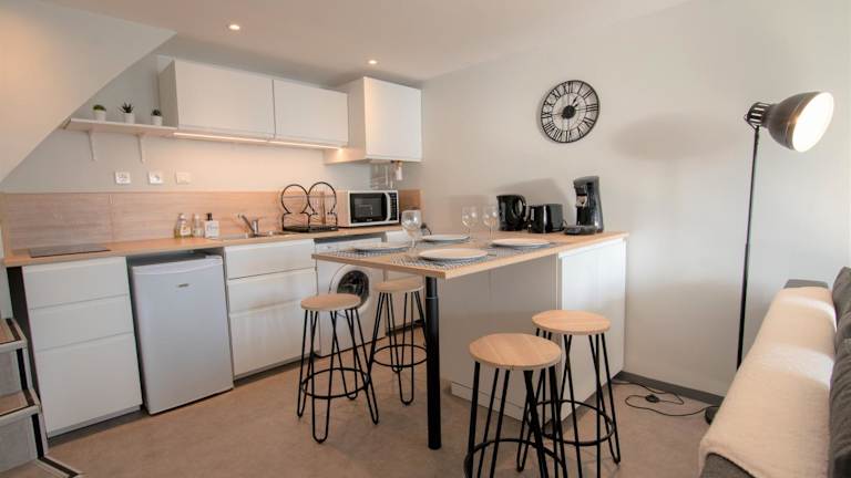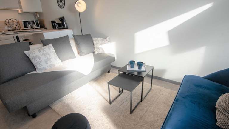 Die Ferienwohnung besteht aus einem Schlafzimmer, einem Wohnzimmer, einer voll ausgestatteten Küche mit Kühlschrank und Kaffeemaschine sowie einem Badezimmer mit Dusche. Handtücher und Bettwäsche werden bereitgestellt.