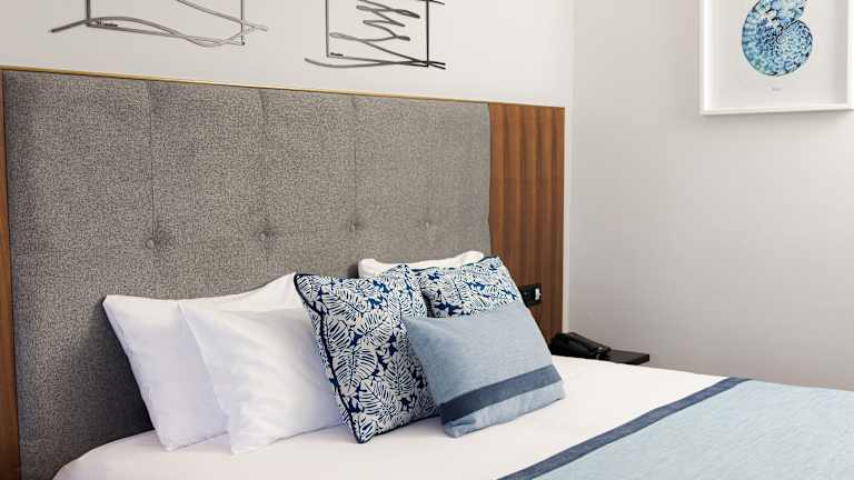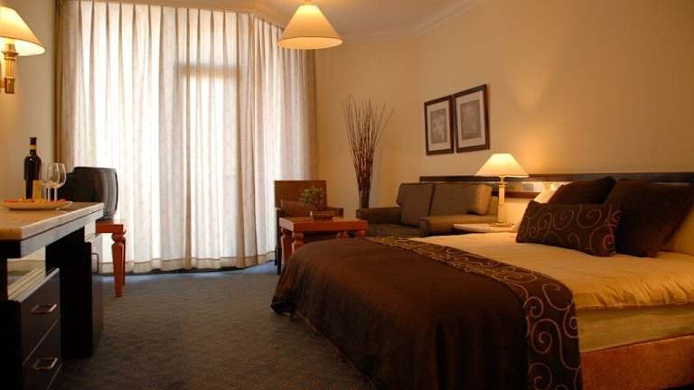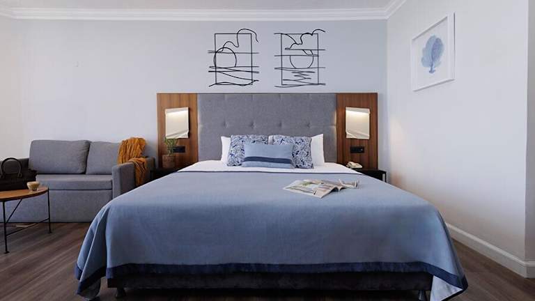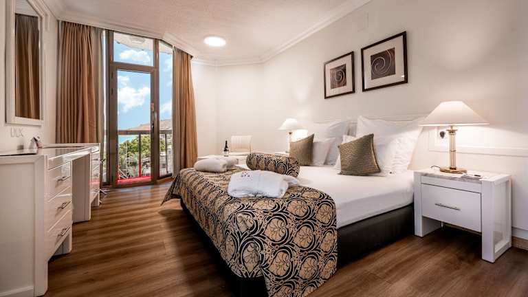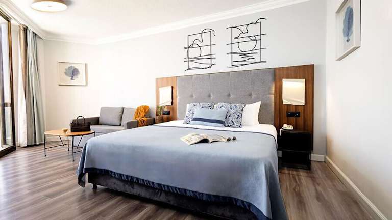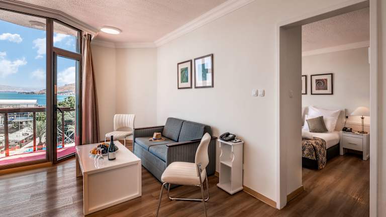 Die Zimmer sind mit Klimaanlage und Heizung ausgestattet und bieten Aussicht auf den See von Balkon oder Terrasse. Die Räume verfügen über Teppichboden, ein Queensizebett, ein Sofabett und die Möglichkeit, Zustellbetten anzufordern. Ein Safe, ein Schreibtisch, Kühlschrank sowie eine Tee-/Kaffeestation sind ebenfalls vorhanden. Das Badezimmer ist mit Dusche und Badewanne ausgestattet und bietet Pflegeprodukte sowie einen Haartrockner.