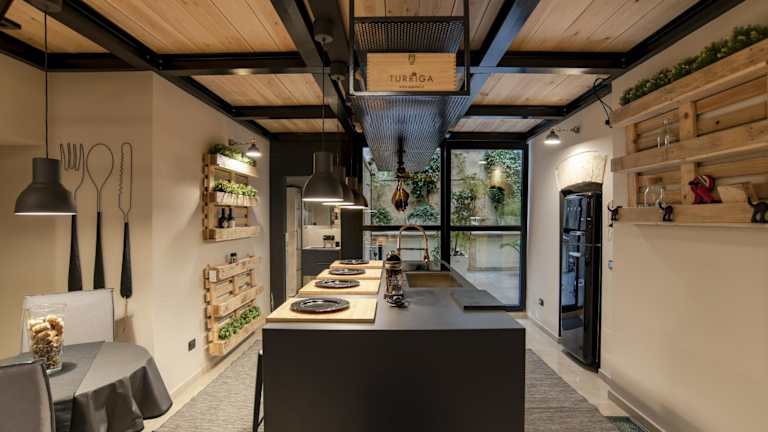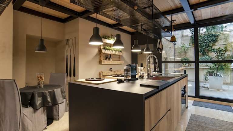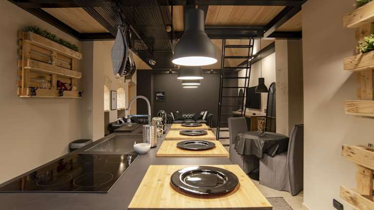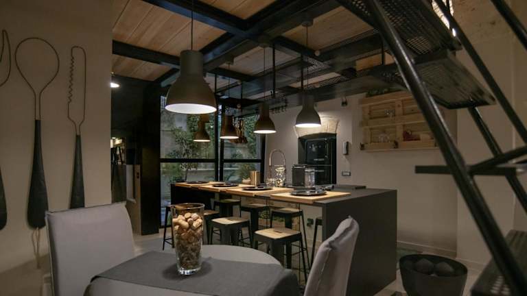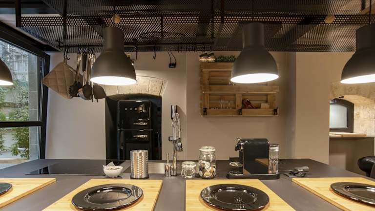 Die Ferienwohnung ist mit einer voll ausgestatteten Küche versehen. Diese beinhaltet einen Kühlschrank, einen Ofen sowie eine Kaffeemaschine, um Mahlzeiten selbst zubereiten zu können.