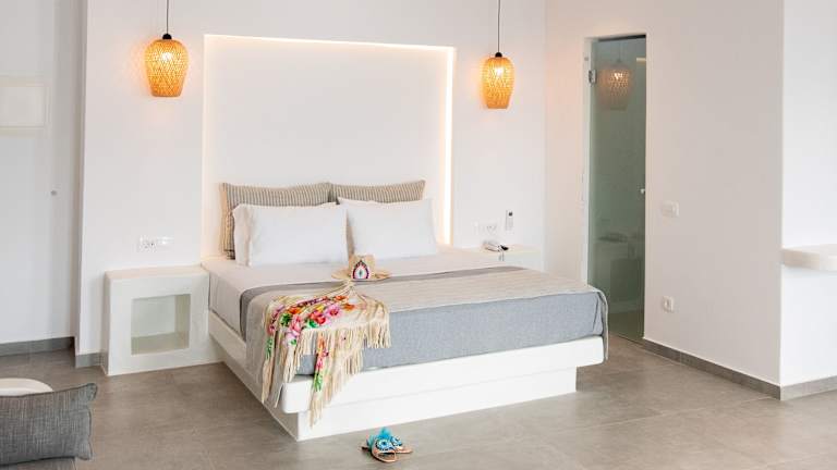 Die Zimmer sind heimelig eingerichtet und verfügen über einen Balkon mit Meerblick. Sie bieten ein Doppelbett, ein Sofabett sowie Zustellbetten auf Anfrage. Zur Ausstattung gehören ein eigenes Badezimmer mit Dusche und kostenlosen Pflegeprodukten, ein Haartrockner, eine Heizung, ein Safe, ein Telefon, Sat-TV sowie Wifi. Es stehen Familien- und Nichtraucherzimmer zur Verfügung.