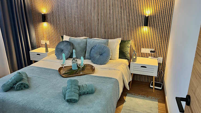 Die Ferienwohnung umfasst ein Schlafzimmer, einen Sitzbereich, ein Badezimmer mit Dusche sowie Handtücher und Bettwäsche. Ein Flachbild-TV ist ebenfalls vorhanden.