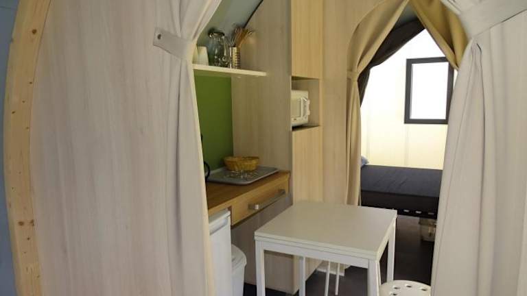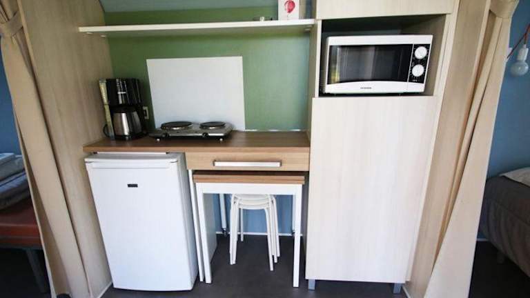 Die Wohneinheiten im Camping Les Maraises verfügen über eine voll ausgestattete Küche mit Essbereich, Kühlschrank und Mikrowelle. Einige Einheiten sind klimatisiert und bieten einen Sitzbereich sowie einen Fernseher. Eine Terrasse ist ebenfalls vorhanden.