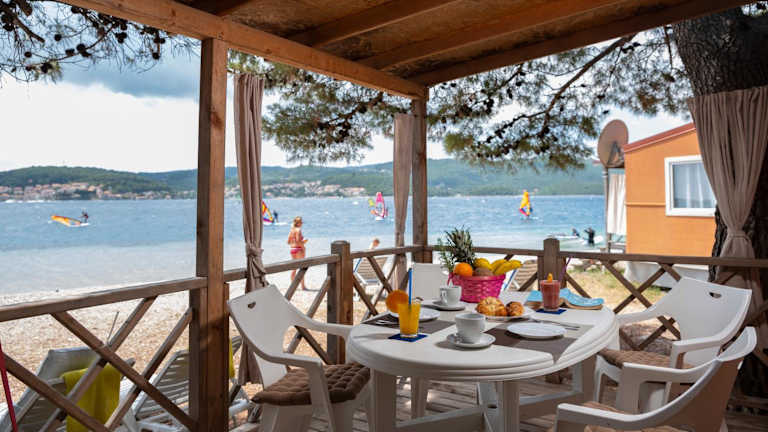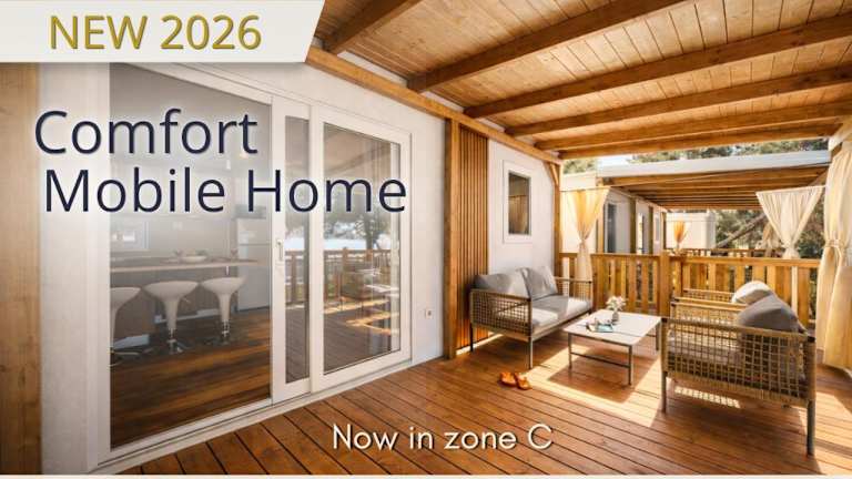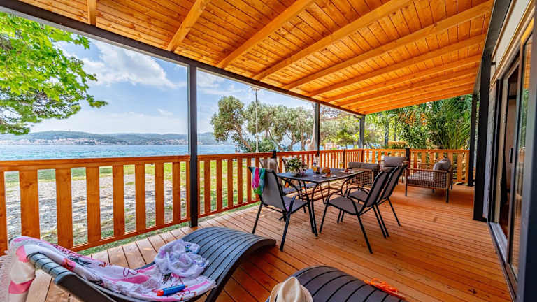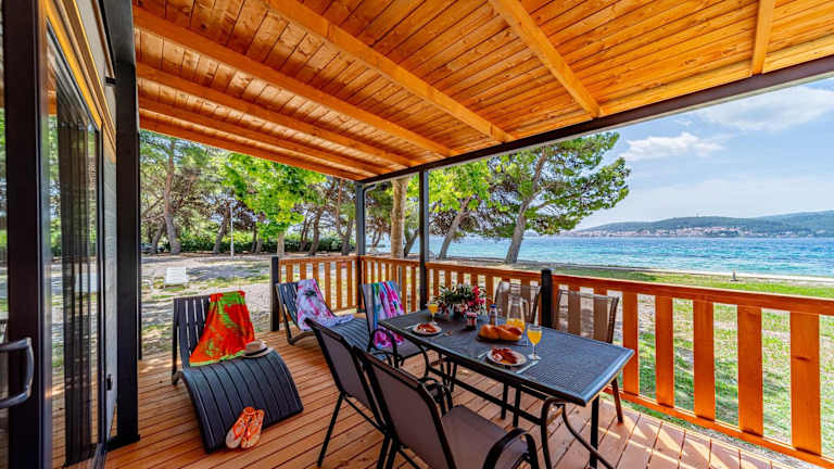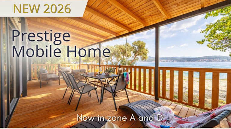 Die Mobilheime sind mit einer gut ausgestatteten Küche und einem Essbereich eingerichtet. Jedes Mobilheim verfügt über eine möblierte Terrasse, die zum Verweilen einlädt.