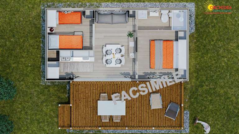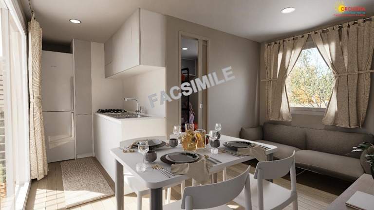 Die Apartments und Mobilheime sind funktional eingerichtet und verfügen über einen eigenen Balkon oder eine Terrasse, ein Schlafzimmer, ein Badezimmer sowie ein Wohnzimmer mit einer Küchenzeile. Jedes Zimmer bietet einen schönen Gartenblick und ist mit Fliesenböden ausgestattet. Bettwäsche und Handtücher können entweder selbst mitgebracht oder auf Anfrage ausgeliehen werden.
