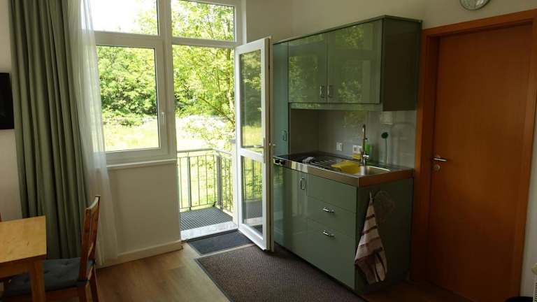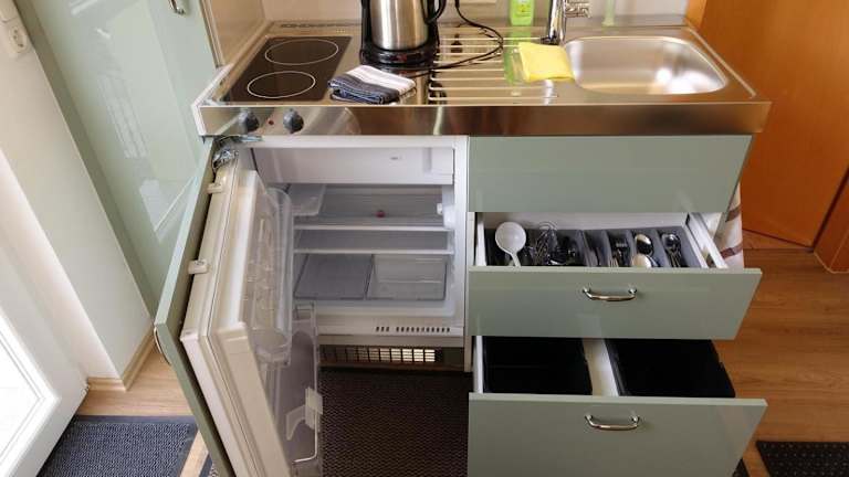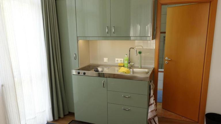 Die Ferienwohnung in Campus Apartment Ernst bietet eine gut ausgestattete Küche mit Kühlschrank und Mikrowelle. Weiterhin sind eine Waschmaschine, Handtücher und Bettwäsche vorhanden.