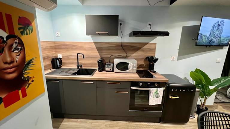 Die Ferienwohnung umfasst ein Schlafzimmer, ein Wohnzimmer und eine voll ausgestattete Küche, die mit einem Kühlschrank und einer Kaffeemaschine ausgestattet ist. Des Weiteren steht ein Badezimmer mit einer Dusche und einem Whirlpool zur Verfügung. Handtücher und Bettwäsche werden gestellt, um den Gästen einen angenehmen Aufenthalt zu garantieren.