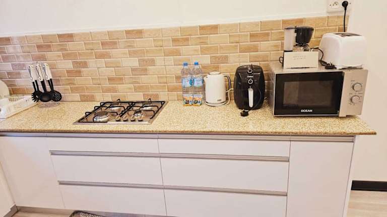 Die Ferienwohnung umfasst ein Wohnzimmer mit TV, eine komplett ausgestattete Küche mit Kühlschrank und Ofen sowie zwei Badezimmer mit Badewanne. Handtücher und Bettwäsche werden bereitgestellt.