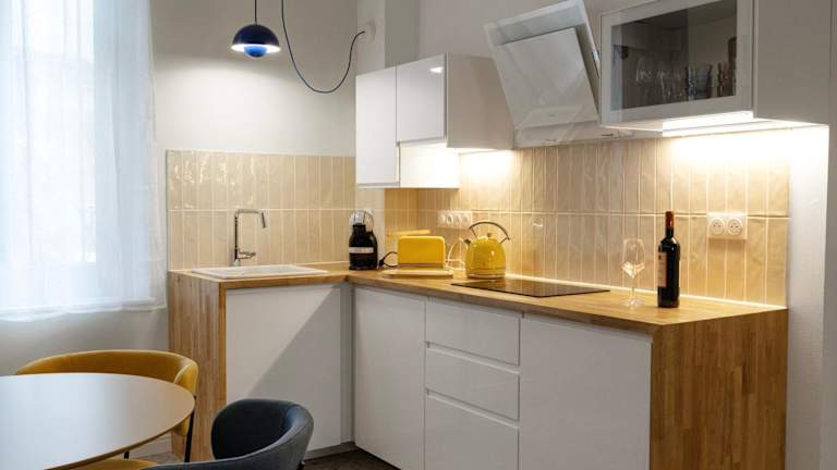 Die Apartments sind mit einer Küche ausgestattet, die einen Kühlschrank, eine Mikrowelle, eine Herdplatte, einen Toaster sowie eine Kaffeemaschine und einen Wasserkocher umfasst.